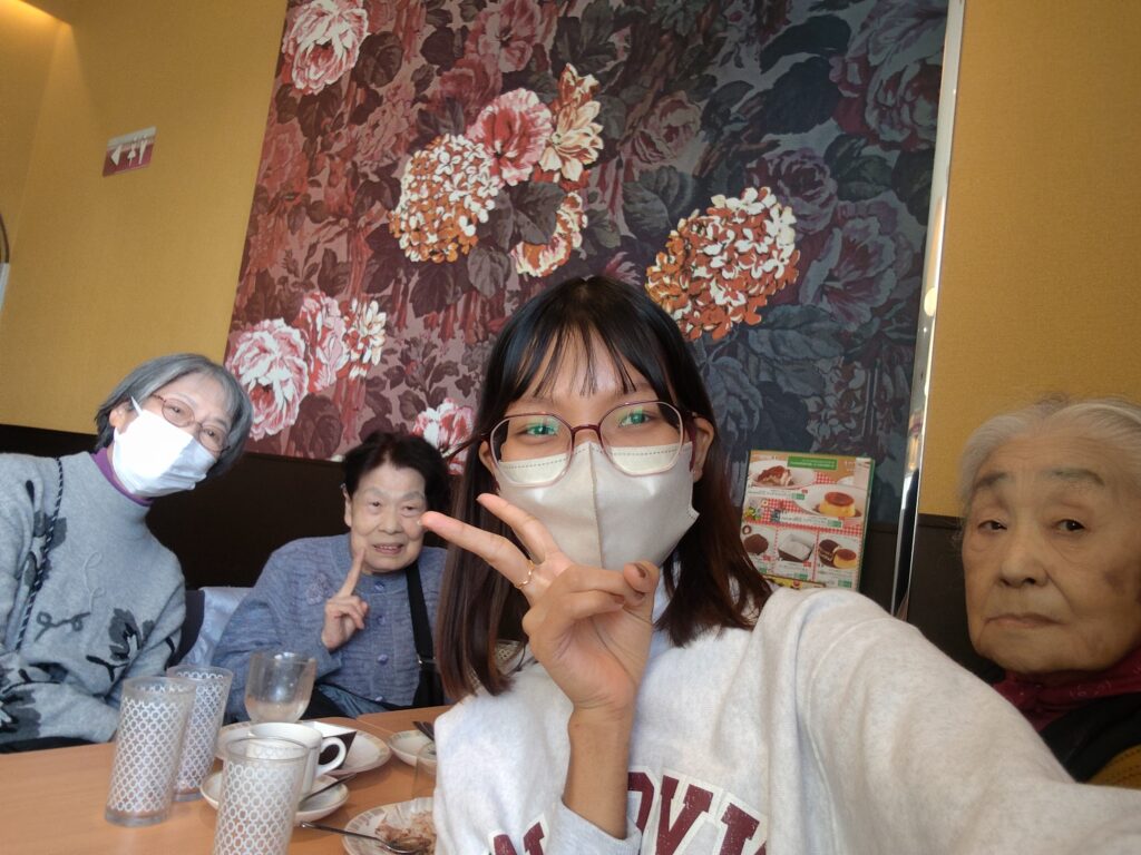 最後に一番楽しいことを言いたいです。 それは今働いてるダレタメでレクをやるとき、おじいさんおばあさんといっしょにゲームをやることです。 おじいさん 、おばあさんを応援したり一緒に写真を撮ったり、スタッフも参加してとても楽しいです。