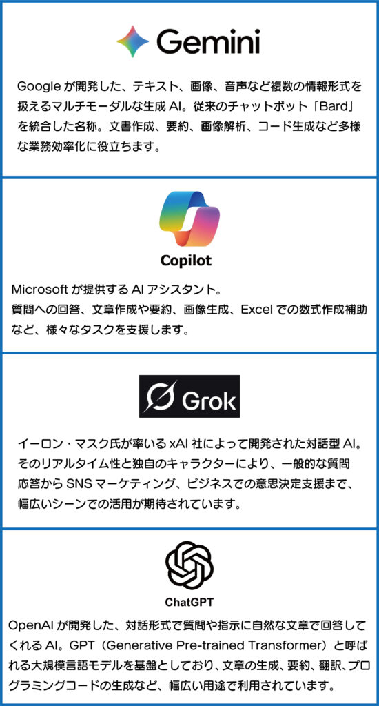 今日は普段私が使用している無料で使える生成AIを紹介がてら、各AIの違いを比較検討してみたいと思います。ちなみに、普段「ジェミニ」「コパイロット」「グロック」「チャットGTP」をよく使っています。