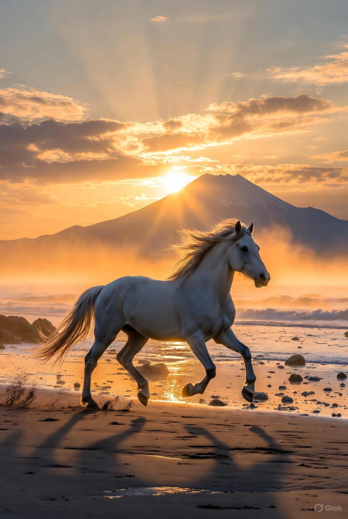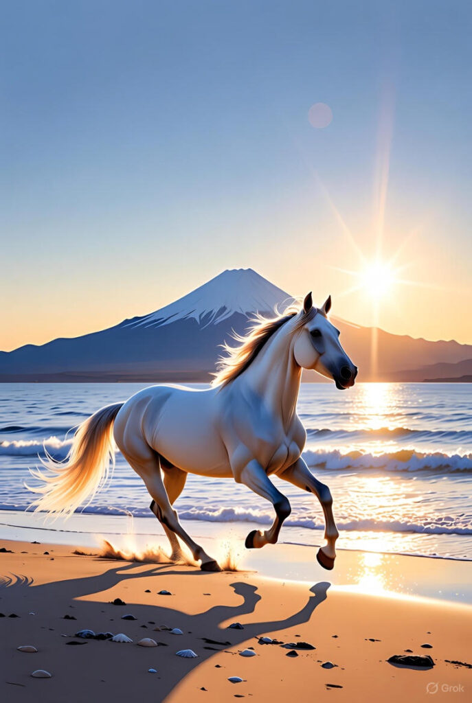 馬の迫力が良い感じです!寒い冬の朝、朝もやの奥に見える富士山と日の出も良い感じ!🤩